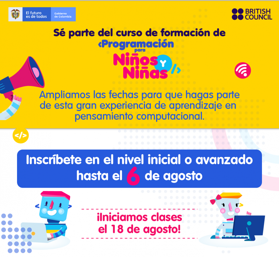 Objetivo: Conformar un banco de docentes elegibles de instituciones educativas oficiales para realizar la formación en temas de pensamiento computacional y programación de la micro:bit, con el objetivo de que los docentes transfieran sus conocimientos a sus estudiantes e implementen proyectos creativos en el aula que promuevan el desarrollo del pensamiento computacional en niñas, niños, adolescentes y jóvenes. Dirigido a: Docentes en servicio activo que se encuentren trabajando en instituciones educativas del sector oficial nacional, en los niveles de educación básica (desde tercero de primaria y secundaria) y educación media, que trabajen con niños, niñas, adolescentes y/o jóvenes entre los 8 y 16 años, ubicados en Establecimientos Educativos o sedes de zonas rurales y urbanas. Requisitos: Ser docente o directivo docente nombrado con tipo de vinculación en propiedad, en periodo de prueba o provisional, de un Establecimiento Educativo Oficial. Ser docente en los niveles de educación básica y media que tengan a su cargo estudiantes entre los 8 y 16 años. Contar con el aval del rector del Establecimiento Educativo donde está vinculado en calidad de docente. No haber sido certificado de la formación en programación para niños y niñas realizada durante el 2019, 2020 o cohorte 1 de 2021. Adelantar acciones de transferencia de conocimiento a mínimo 30 estudiantes que se encuentren entre los 8 y 16 años y a su vez generar evidencias del proceso que serán entregadas posteriormente al British Council. Nota: si no cuenta con esta cantidad de estudiantes (30 mínimo) no cumple con uno de los criterios de selección. Si el tipo de nombramiento es provisional, el docente deberá anexar por lo menos 5 días antes de recibir el beneficio (en caso de que sea seleccionado) una actualización de su estado en la planta docente. El periodo de provisionalidad de los docentes seleccionados en esta modalidad debe ser superior al tiempo que dura el proceso de formación (diciembre 31 de 2021) Cada participante debe garantizar que cuenta con conectividad y con un computador o tablet para la ejecución de encuentros sincrónicos y para desarrollar el curso que será de manera virtual. NOTA: Se podrán postular los docentes que en vigencias anteriores se hayan postulado y no fueron beneficiarios. Fechas clave: Inscripción Desde 16 de junio hasta 6 de agosto 2021 a las 11:59 p.m. Verificación y cumplimiento de requisitos 6 de Agosto al 13 de Agosto de 2021 Publicación Conformación del banco de elegibles 17 de agosto de 2021 formación cohorte 2 18 de agosto hasta el 1 de octubre de 2021