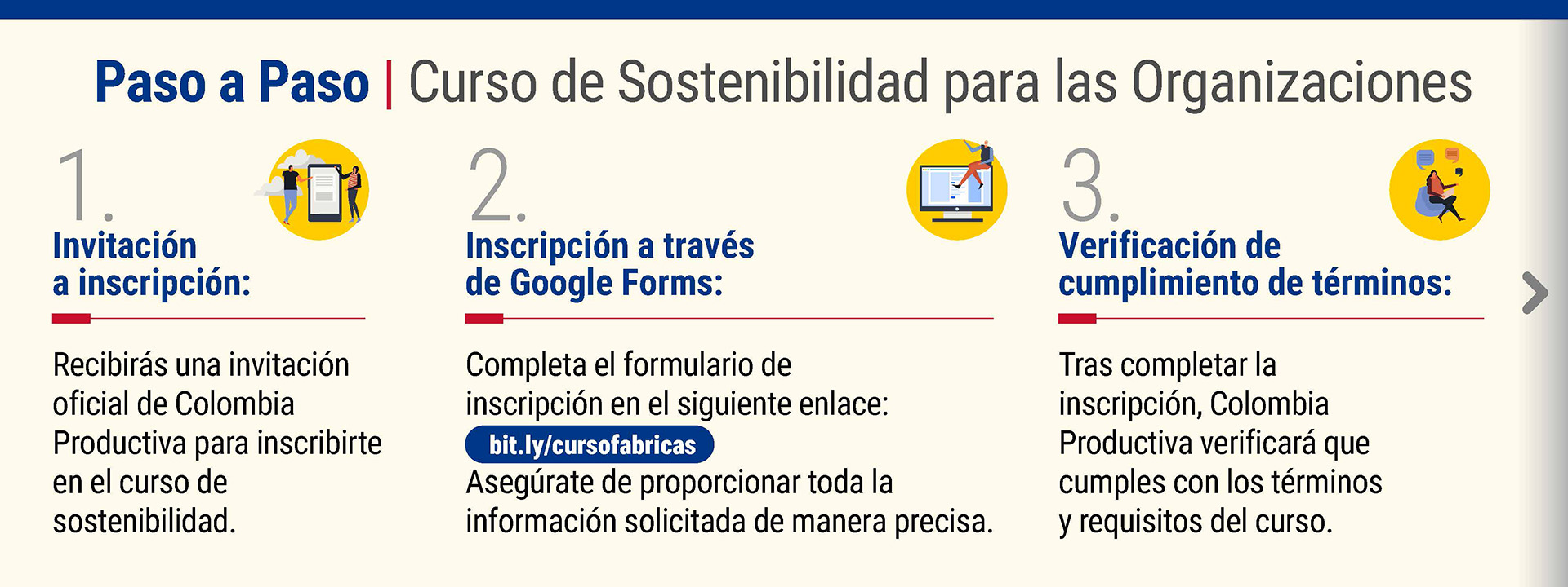 Una vez diligenciado el formulario, Colombia Productiva te contactará en el transcurso de 8 días hábiles notificando el cumplimiento de los requisitos.