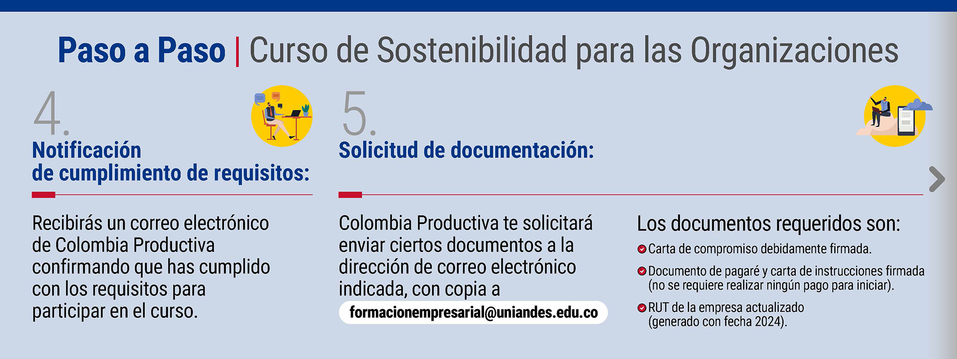 Los documentos que se solicitan son: firma del pagaré, carta de compromiso y el RUT actualizado. Estos documentos los deben enviar a la Universidad de los Andes: formacionempresarial@uniandes.edu.co